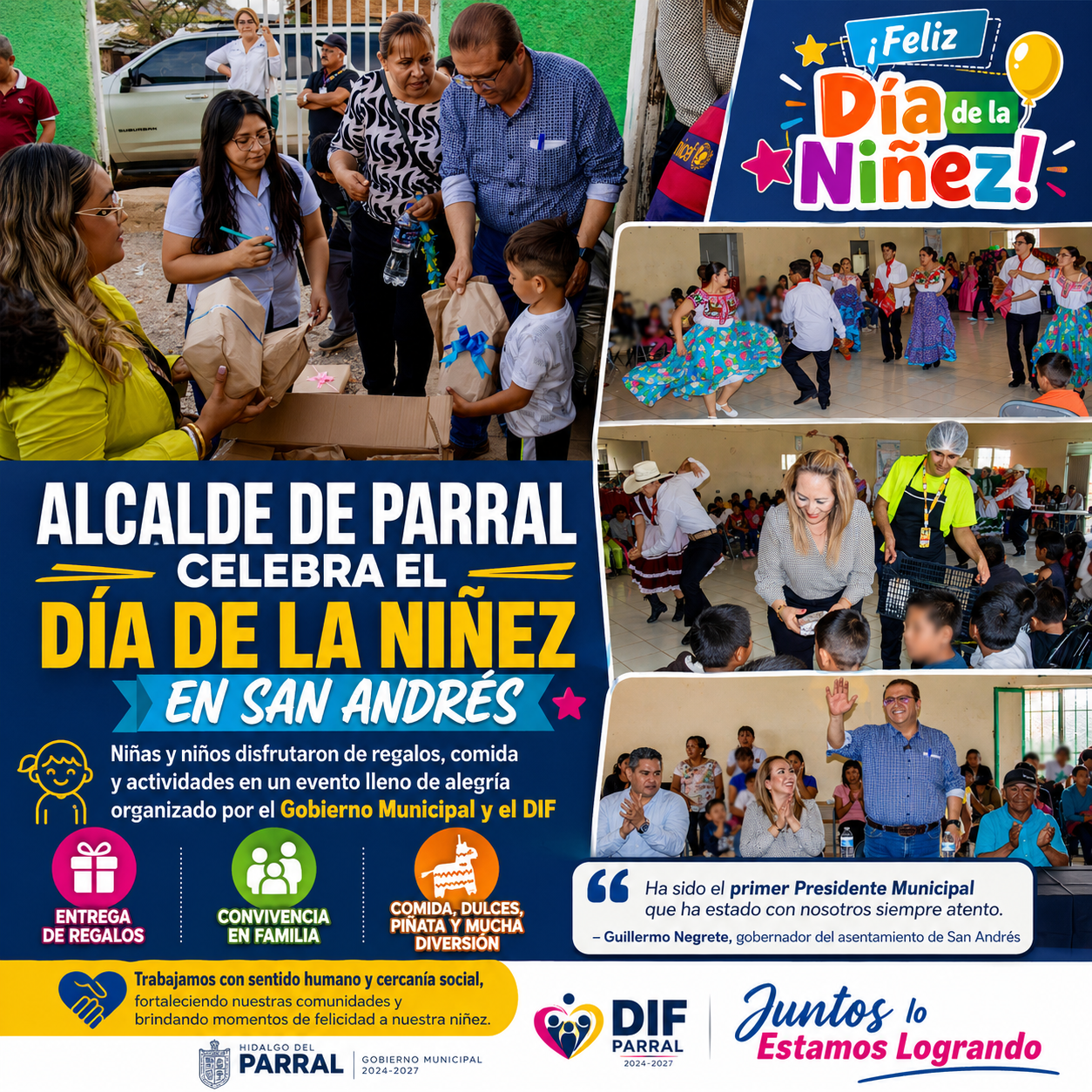 En el marco del Día de la Niñez, el presidente municipal de Parral, Salvador Calderón, acompañado de su esposa Nora Carrillo de Calderón, llevó alegría a las niñas y niños de la comunidad de San Andrés, quienes disfrutaron de un ambiente de fiesta, comida y múltiples regalos.