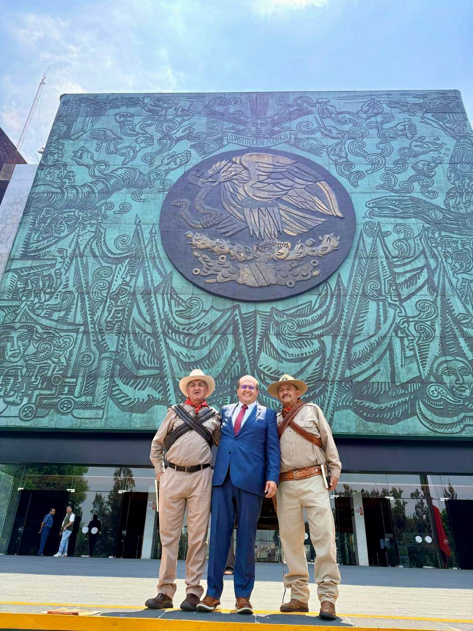 En esta visita, el Presidente Municipal estuvo acompañado por actores del grupo de teatro Guillermo Baca, quienes realizan la representación de la muerte del general Francisco Villa, así como por el director de Turismo Lic. Emmanuel Espinosa Hernández, fortaleciendo la proyección cultural de esta importante escenificación a nivel nacional.