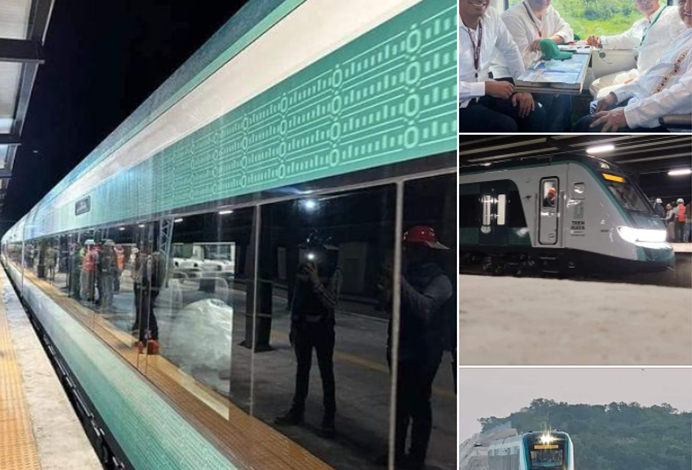 Con AMLO y varios gobernadores a bordo, el tren hizo un recorrido de prueba de 156 km, de los 1554 km a través de 5 estados que este tendrá de recorrido, una vez que esta obra sea inaugurada en aproximadamente 3 meses.