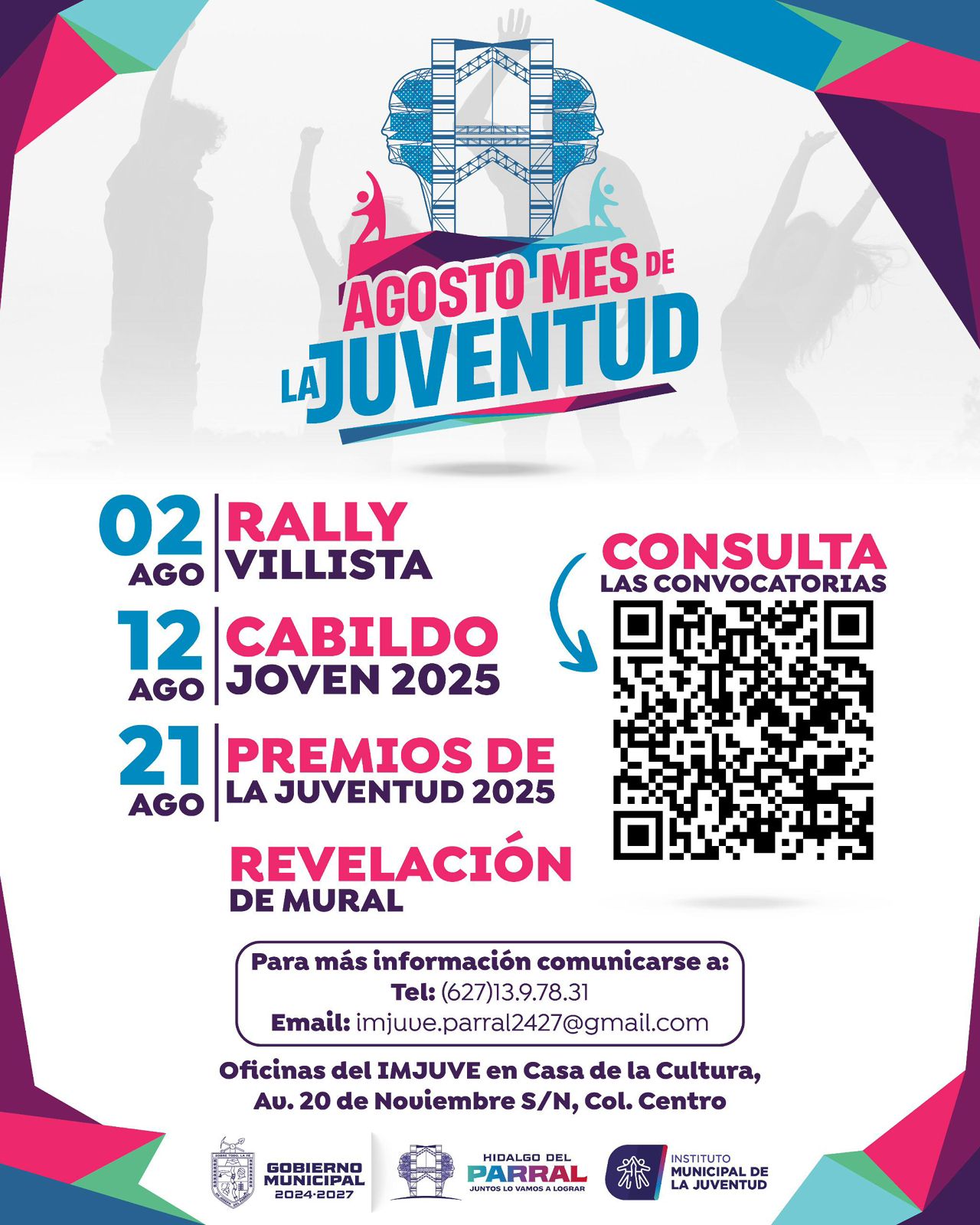 Cabildo Joven 2025, a celebrarse el 12 de agosto en el Salón Miguel Hidalgo. Será un ejercicio cívico donde jóvenes estudiantes encabezarán una sesión de Cabildo con propuestas enfocadas al desarrollo de la ciudad. El registro está abierto hasta el 30 de julio al correo imjuve.parral2427@gmail.com o vía WhatsApp al (627) 139 7831.