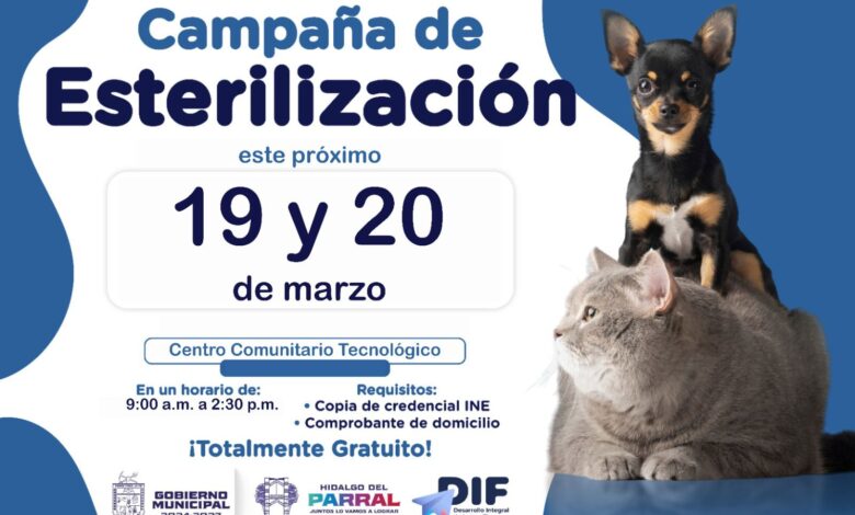 El Gobierno de Parral, encabezado por el alcalde Salvador Calderón Aguirre, anunció la realización de una campaña de esterilización que se llevará a cabo los próximos 19 y 20 de marzo. Esta iniciativa es resultado de la coordinación entre Presidencia Municipal, DIF Municipal, Médico Cerca de Ti, Centro Veterinario, el Distrito 3 de Salud y diversas instituciones educativas, con el objetivo de prevenir problemáticas de salud pública mediante acciones directas en la comunidad.