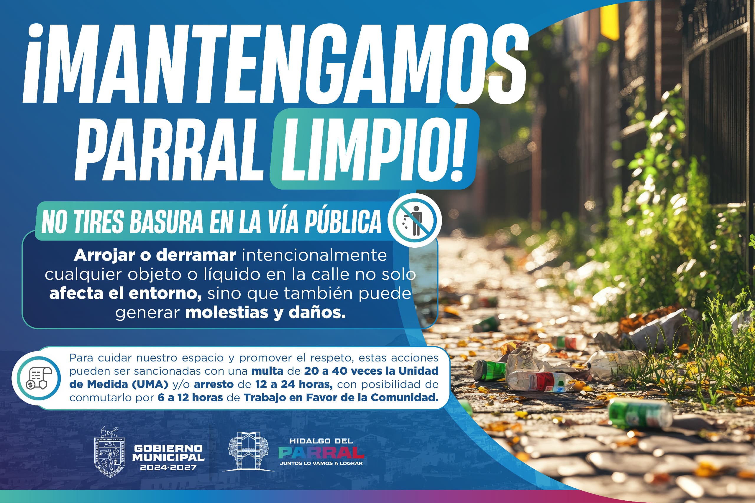 Con el objetivo de mantener una ciudad ordenada y en condiciones adecuadas para todos, el Gobierno de Hidalgo del Parral, encabezado por el alcalde Salvador Calderón, dio inicio a la campaña “Parral Limpio”. Esta iniciativa contempla la aplicación de sanciones a quienes arrojen basura u objetos en la vía pública, conforme a lo establecido en el Reglamento de Justicia Cívica, Bando de Policía y Buen Gobierno.