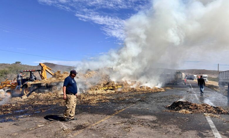 De acuerdo con la información, la unidad transportaba aproximadamente 23 toneladas de material, lo que requirió la intervención de varias unidades y el apoyo de pipas de la Junta Municipal de Agua y Saneamiento (JMAS), así como de un particular para lograr el control del fuego de manera oportuna.