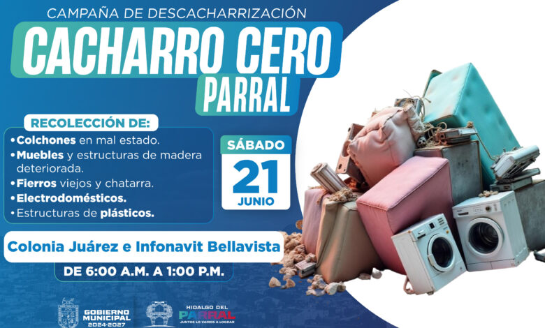El Gobierno de Parral, a través de la Dirección de Servicios Públicos, anuncia que este sábado se llevará a cabo una nueva jornada de la campaña “Cacharro Cero”, en beneficio de las colonias Juárez e Infonavit Bellavista. El operativo de recolección se efectuará en un horario de 6:00 de la mañana a 1:00 de la tarde.