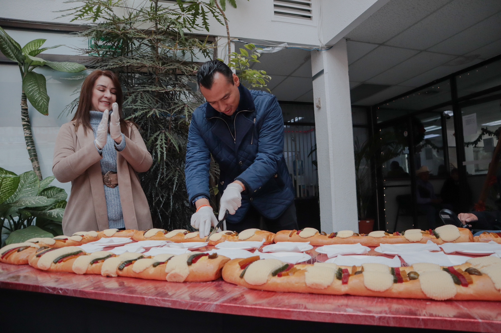 El simbólico acto contó con la presencia de la titular de Finanzas, Norma Duarte Rangel, así como del regidor César Chávez Hernández, quienes colaboraron en el corte de la Rosca de Reyes donde la tradición marca que quien encuentre la figura del Niño Dios en su rebanada habrá de poner los tamales el 2 de febrero, Día de la Candelaria.