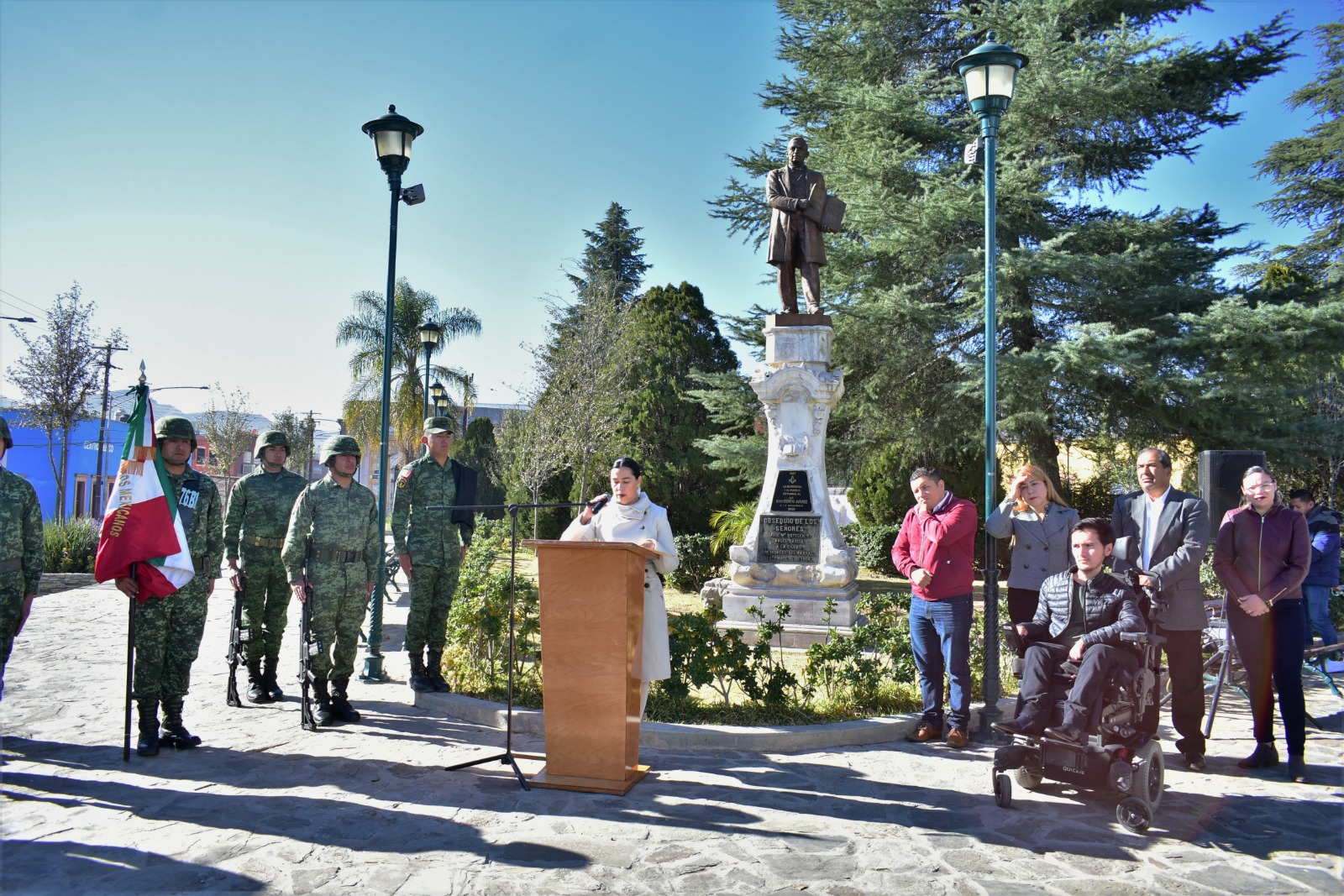 Los honores militares corrieron a cargo de la Escolta y Banda del 76 Batallón de Infantería en presencia de la fracción de regidores, funcionarios municipales y la titular de los SEECH Región Sur.