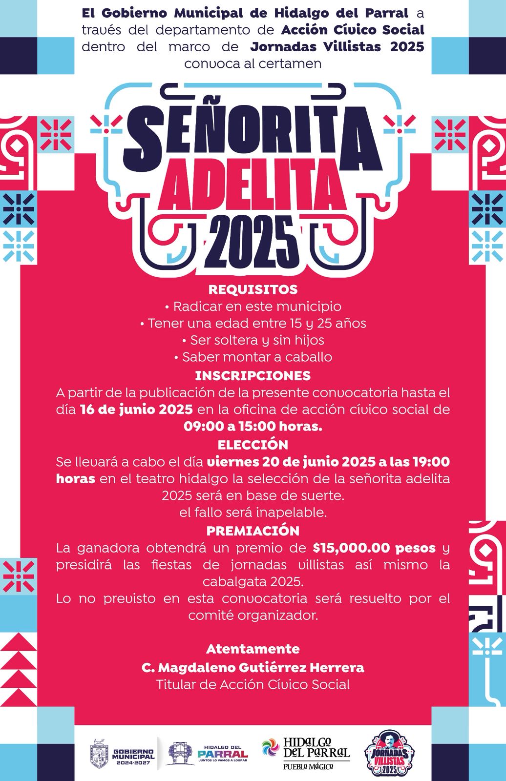Como parte de las actividades conmemorativas de las Jornadas Villistas 2025, el Gobierno de Parral, a través del Departamento de Acción Cívico Social, mantiene abierta la convocatoria para participar en el certamen “Señorita Adelita 2025”, dirigido a jóvenes mujeres del municipio que deseen representar el espíritu revolucionario femenino.