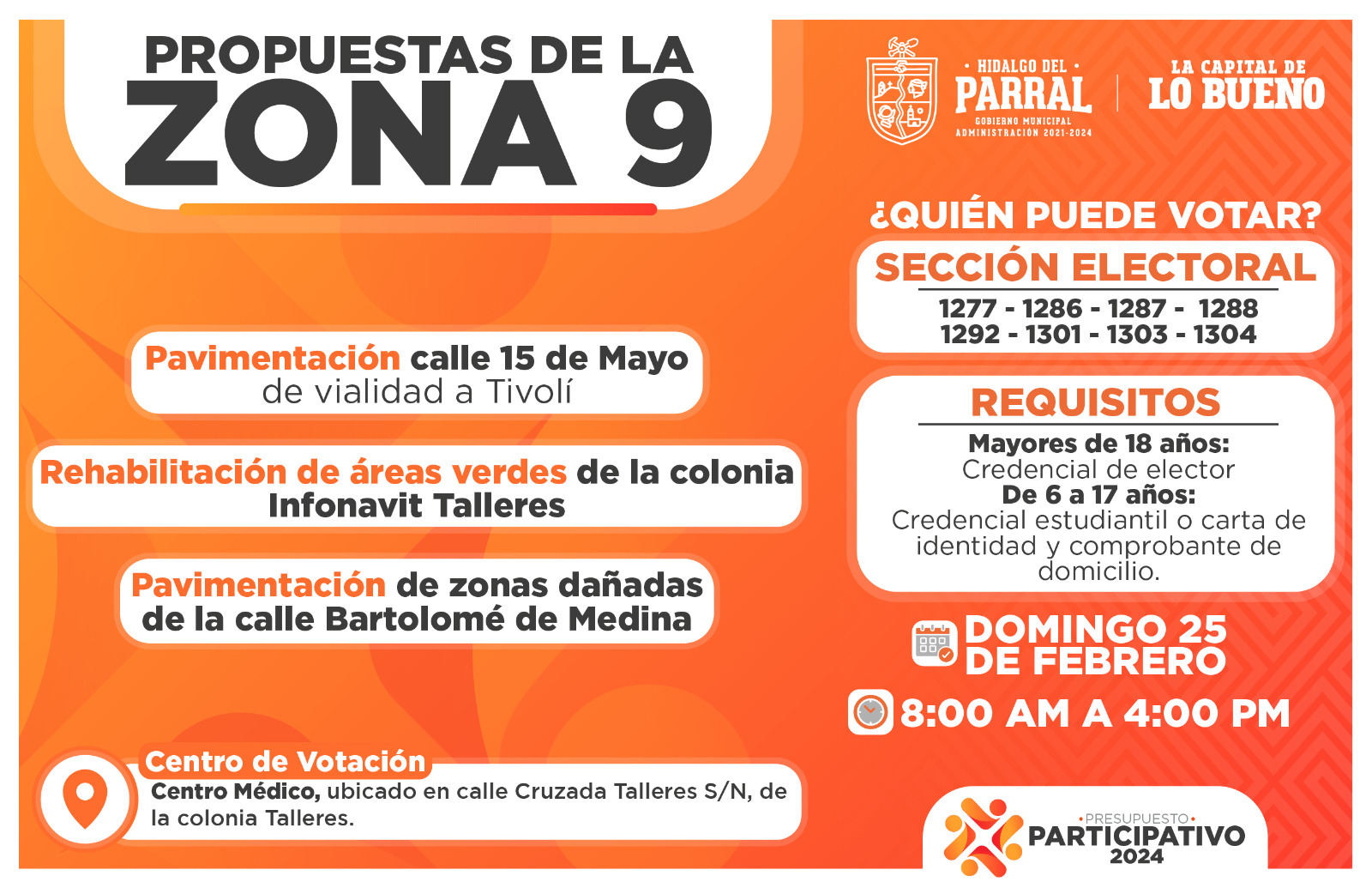 El próximo domingo 25 de febrero, la ciudadanía de Parral tendrá la oportunidad de participar activamente en la selección de obras prioritarias para su zona, a través del proceso de Presupuesto Participativo. Este año, la *Zona 9* de Parral presenta tres obras finalistas que podrán elegir los ciudadanos y así mejorar su entorno.