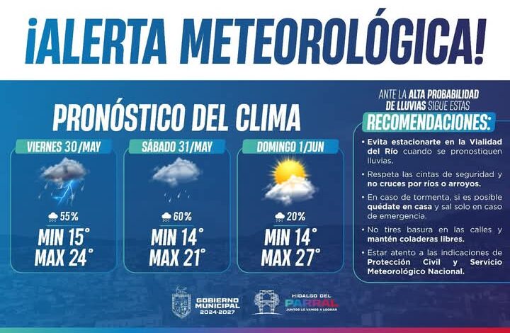 El Gobierno de Parral, a través de la Coordinación Municipal de Protección Civil, informa a la población sobre la probabilidad de lluvias para este fin de semana. De acuerdo con los pronósticos, existe una posibilidad del 55% para el día de hoy, así como 60% y 20% durante el fin de semana.
