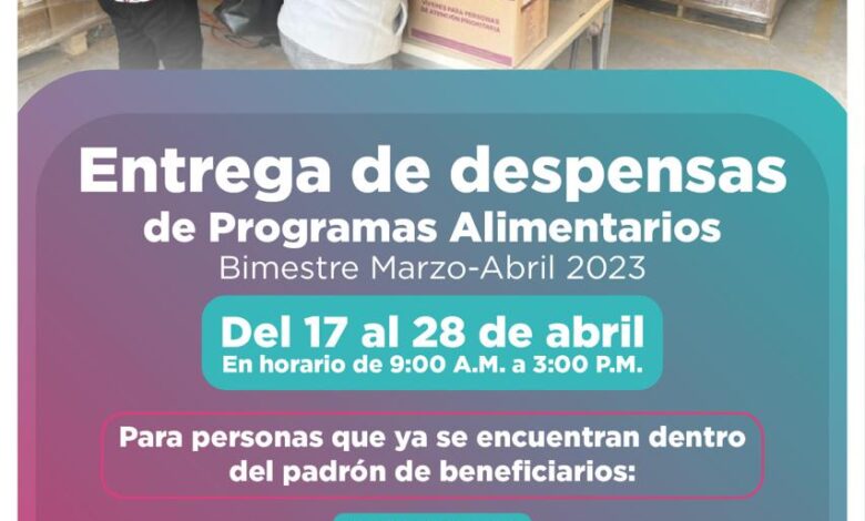 El DIF Municipal informa que del 17 al 28 de abril, se llevará a cabo la entrega de despensas para las personas beneficiarias de Programas Alimentarios, cuyo apoyo corresponde al bimestre marzo – abril.