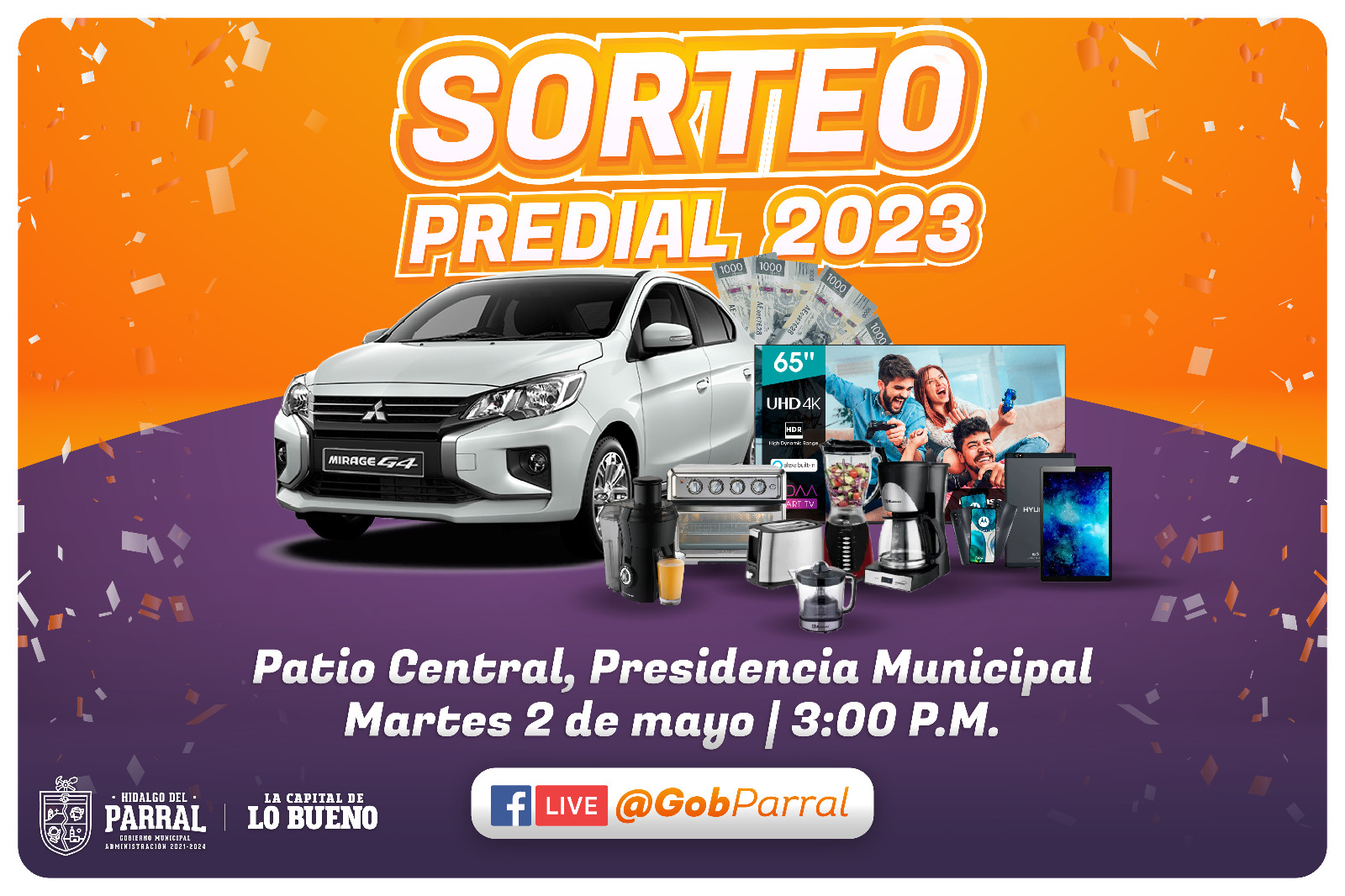 El Gobierno de Parral invita este 2 de mayo al Gran Sorteo del Predial 2023, el cual se efectuará en el patio central de la Presidencia Municipal a las 3:00 de la tarde; o bien, seguir la transmisión vía Facebook.
