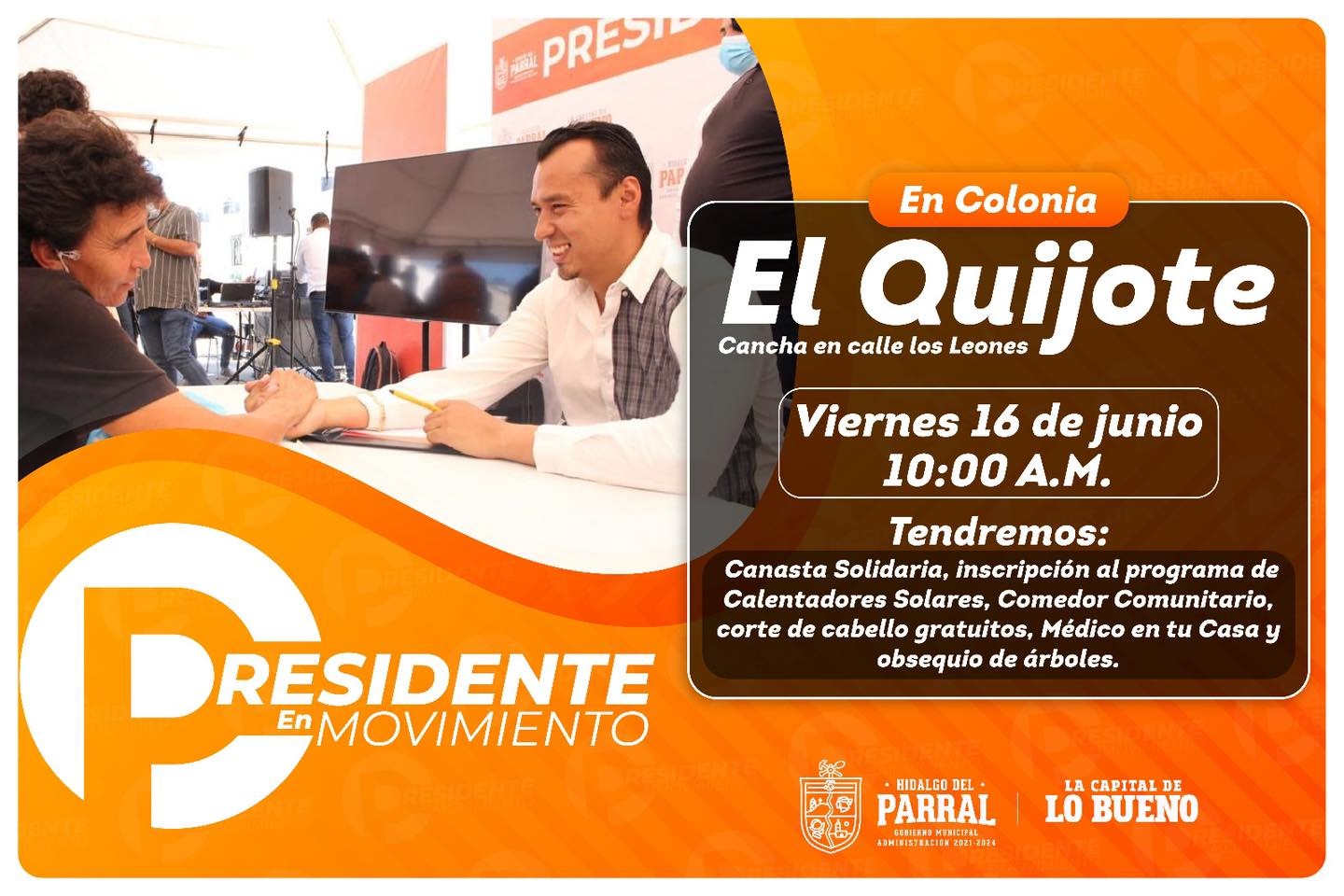 Todo está listo para que este viernes 16 de junio, los servicios del programa municipal “Presidente en Movimiento” lleguen a los habitantes de la colonia El Quijote, justo en la cancha ubicada en la intersección de las calles Los Leones y Ventero, a partir de las 10:00 de la mañana.