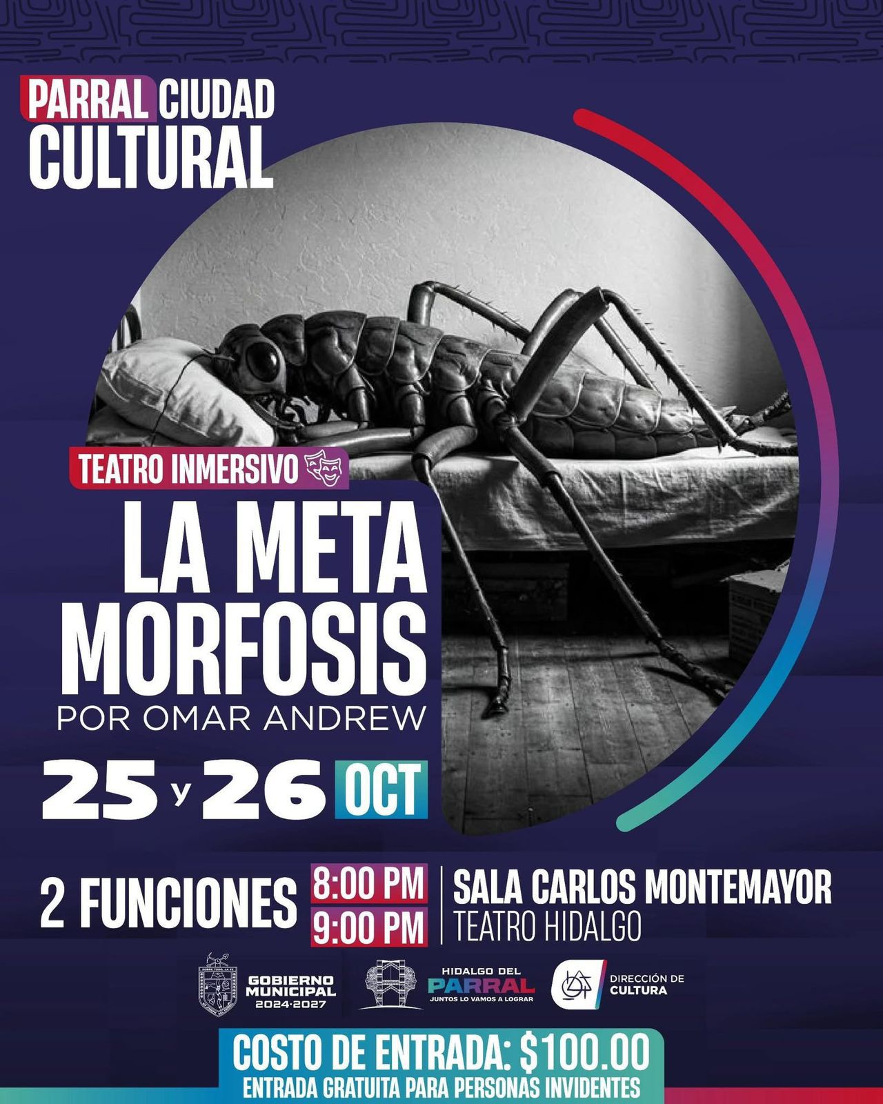 El Gobierno de Parral, a través de la Dirección de Cultura, invita a disfrutar de una propuesta escénica que promete revolucionar la manera en que se vive el teatro, la obra “La Metamorfosis”, de Omar Andrew, que se presentará los días 25 y 26 de octubre en la Sala Carlos Montemayor del Teatro Hidalgo.