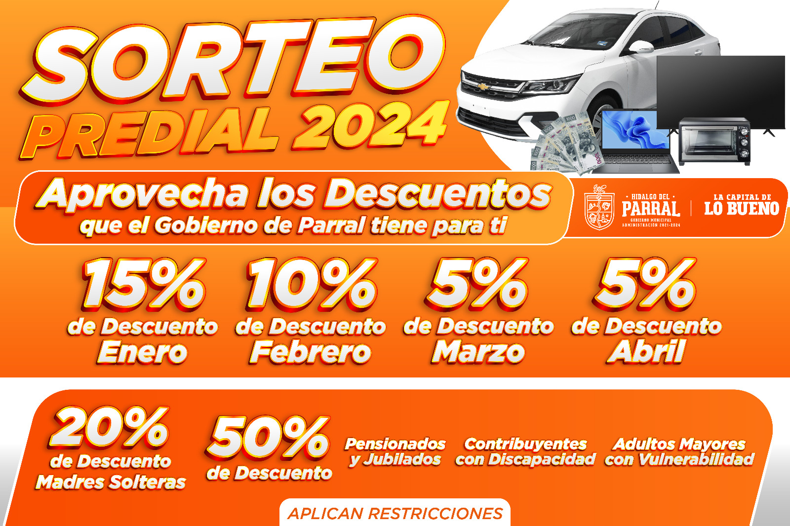Además de los descuentos mencionados, todos los contribuyentes que realicen su pago del Impuesto Predial durante estos primeros meses del año participarán en el sorteo de premios, destacando la oportunidad de ganar un automóvil último modelo, así como pantallas, premios en efectivo, electrodomésticos y computadoras.