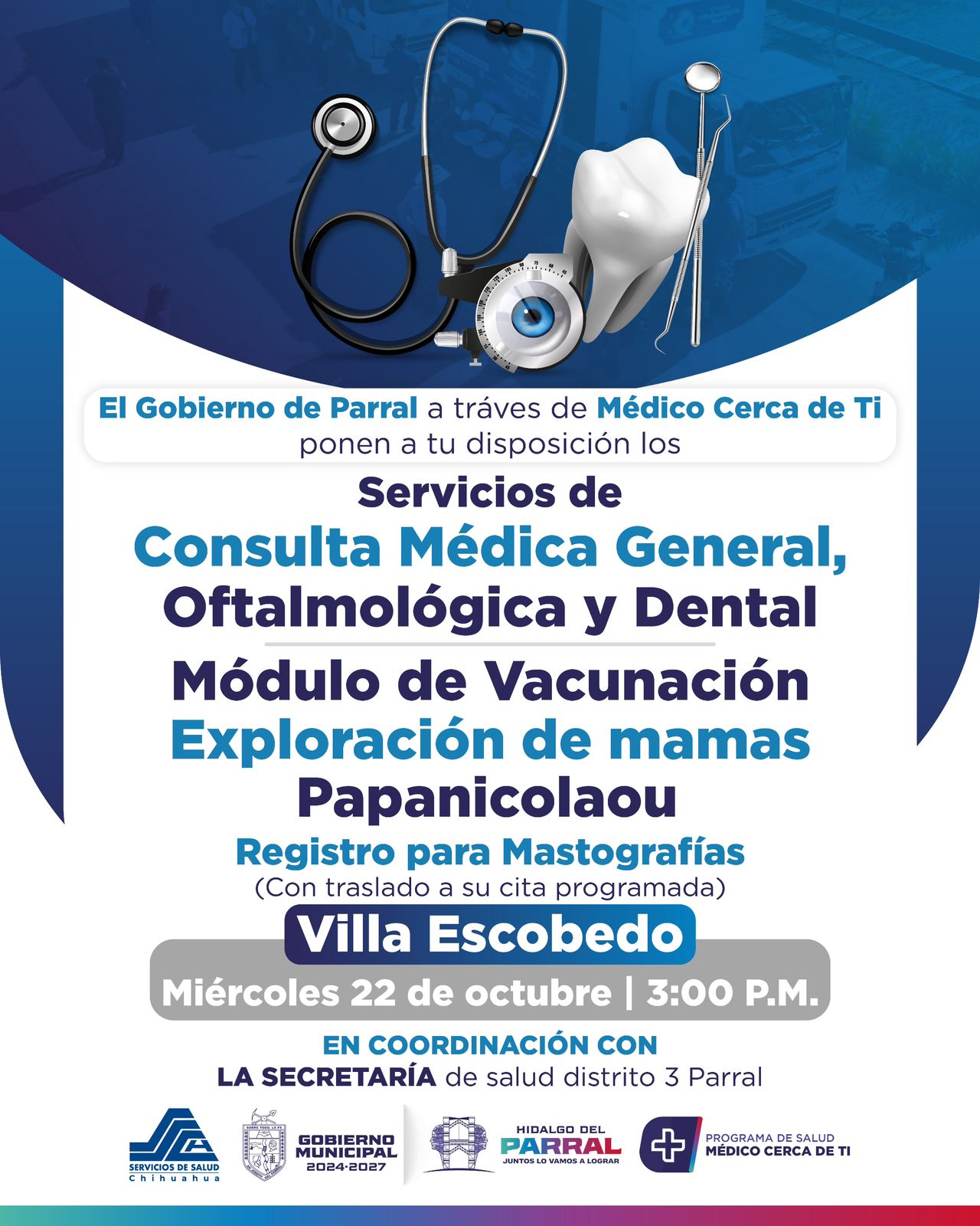 El Gobierno de Parral anuncia una jornada integral de servicios médicos y preventivos a través del programa «Médico Cerca de Ti” en coordinación con la Secretaría de Salud del Distrito 3, con el objetivo de acercar la atención especializada directamente a la comunidad de Villa Escobedo.