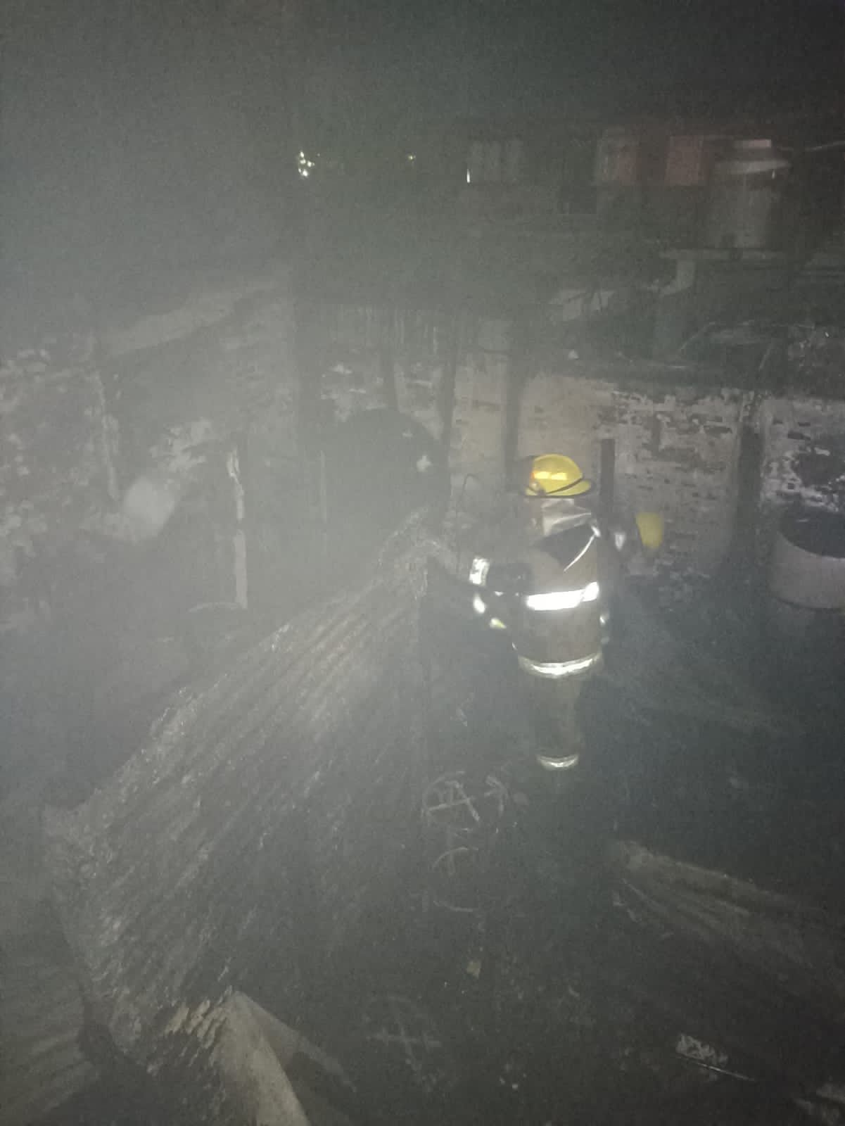 Realizando las maniobras para sofocar el incendio en el cual hubo perdidas en muebles de madera, aparatos electrodomésticos, una carriola, así como enseres domésticos, así como la estructura del cuarto y láminas de mismo.