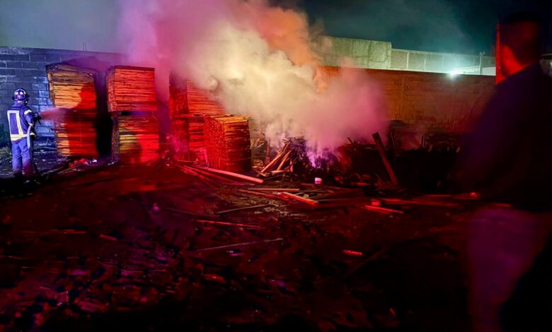 El fuego consumió principalmente tabletas de madera apiladas en aproximadamente 40 tarimas, lo que representa el monto estimado de las pérdidas.