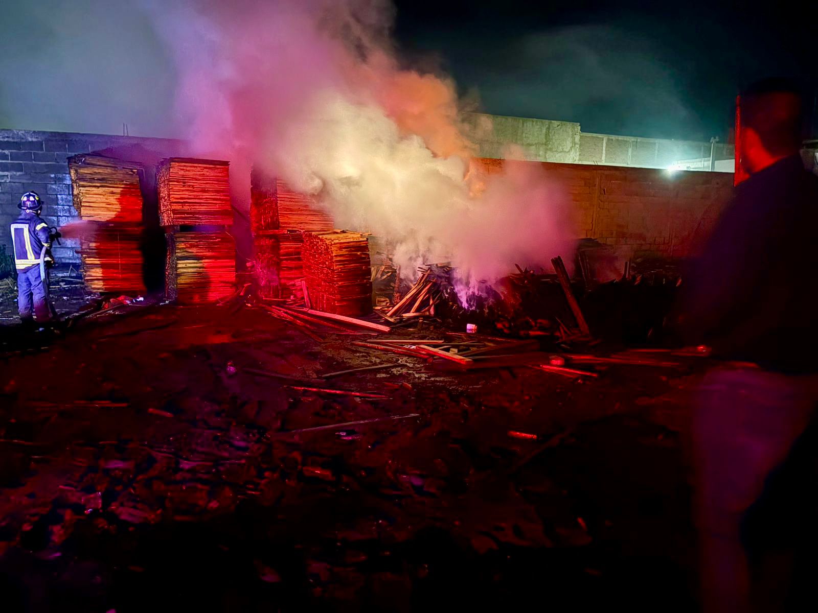 El fuego consumió principalmente tabletas de madera apiladas en aproximadamente 40 tarimas, lo que representa el monto estimado de las pérdidas.