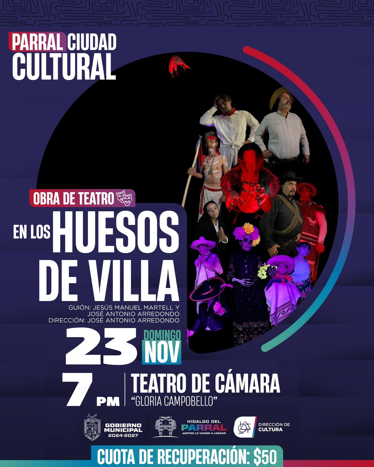 El Gobierno de Parral, a través de la Dirección de Cultura, invita a todas y todos a disfrutar de la obra teatral En los Huesos de Villa, una presentación que busca acercar al público a un capítulo esencial de la historia local mediante una narrativa fresca y emotiva.