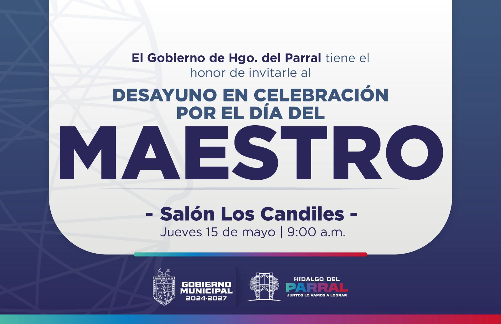 El Gobierno Municipal de Hidalgo del Parral, encabezado por el alcalde Salvador Calderón, invita a todas las maestras y maestros del municipio a participar en un desayuno con motivo del Día del Maestro, como muestra de gratitud por su labor educativa y formativa.