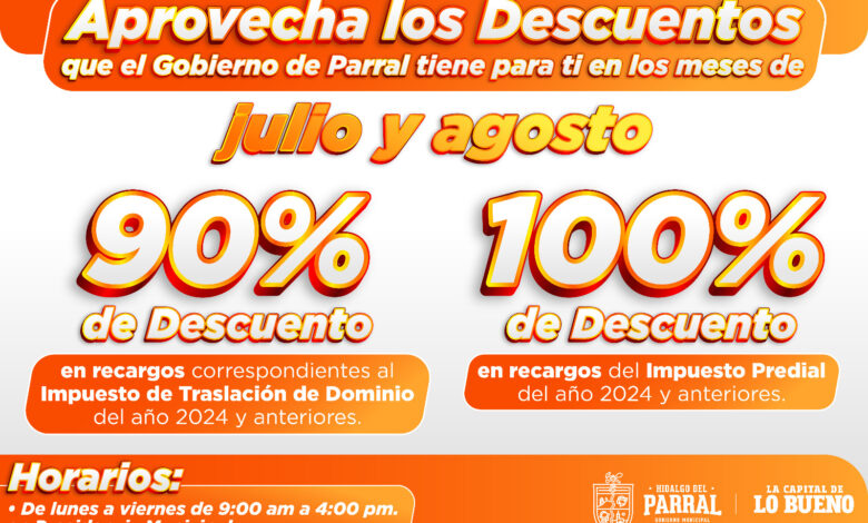 El Gobierno de Parral invita a los contribuyentes a aprovechar durante los meses de julio y agosto, los descuentos de hasta el 100 por ciento en recargos del impuesto predial y hasta el 90 por ciento de descuento en los recargos del impuesto de traslación de dominio, del año 2024 y anteriores.