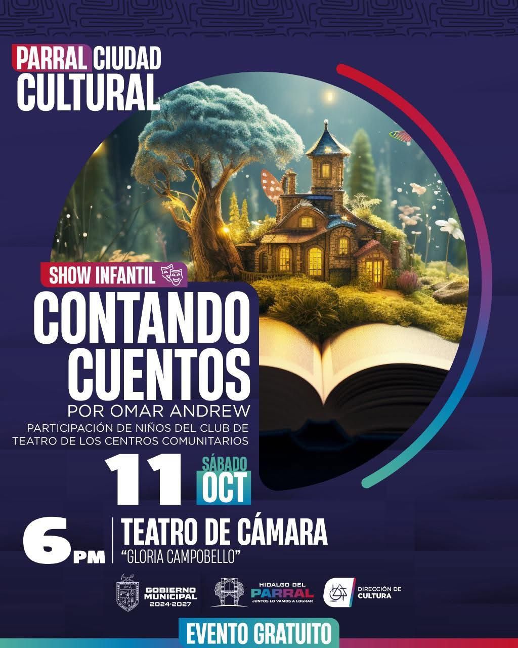 El Gobierno de Parral, a través de la Dirección de Cultura, invita a todas las niñas, niños y familias de la ciudad a disfrutar del show infantil “Contando Cuentos”, una presentación especial encabezada por el talentoso parralense Omar Andrew, quien promete una tarde llena de diversión, imaginación y aprendizaje.