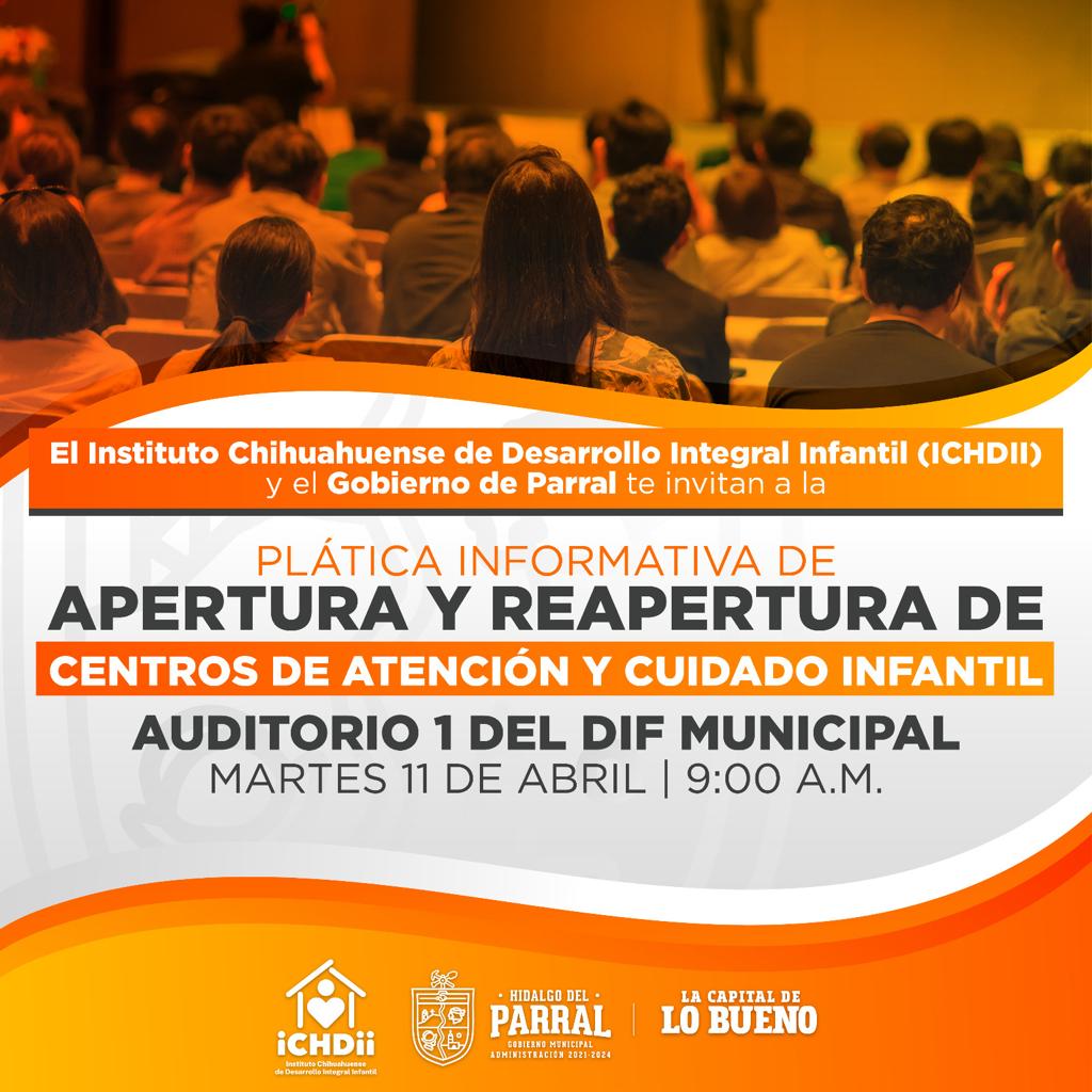 El Gobierno de Parral y el Instituto Chihuahuense de Desarrollo Integral Infantil invitan a la plática informativa de apertura y reapertura de los Centros de Atención y Cuidado Infantil, la cual se efectuará este martes 11 de abril a las 9:00 de la mañana en el auditorio 1 del DIF Municipal.