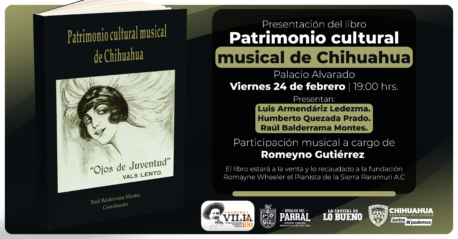 El próximo viernes 24 de febrero a las 19:00 horas se llevará a cabo la presentación del libro «Patrimonio Cultural Musical de Chihuahua», coordinado por Raúl Balderrama Montes. El evento se realizará en el Palacio Alvarado y contará con la participación del Gobierno de Parral y el Gobierno del Estado, con el fin de que las ventas del libro sean donadas a la fundación Romayne Wheeler el Pianista de la Sierra Ráramuri A.C.