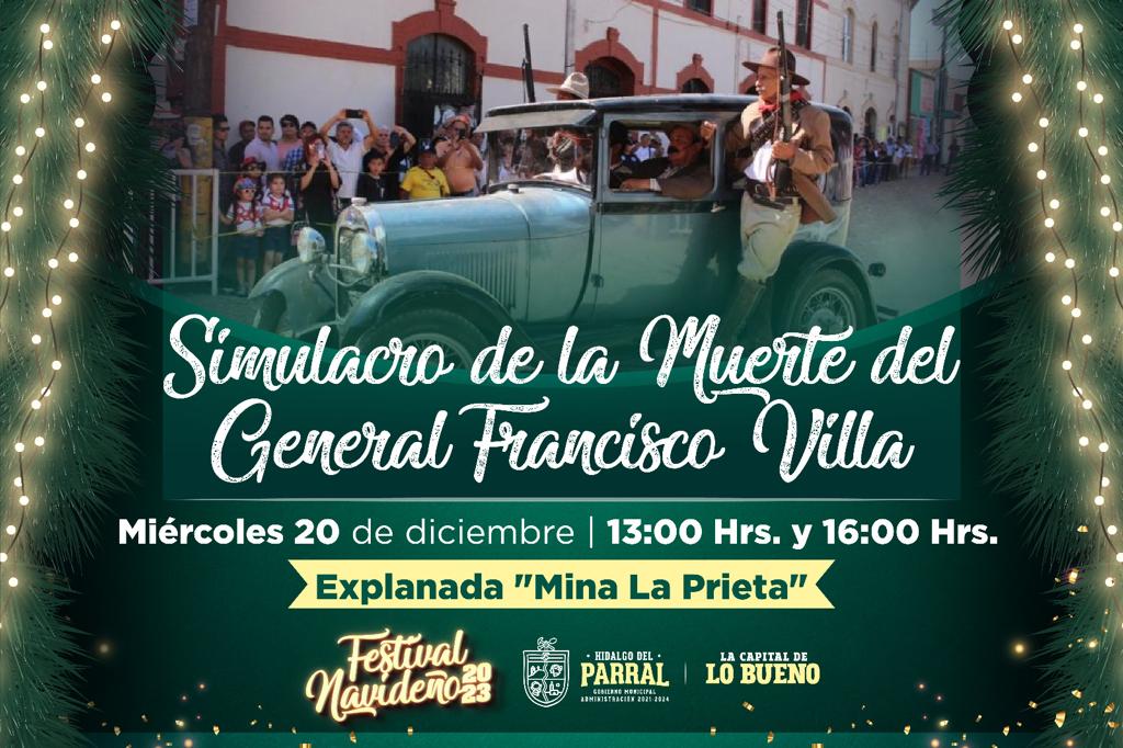 El Gobierno de Parral invita a la comunidad y a visitantes de la ciudad a los simulacros de la vida y muerte del General Francisco Villa, este 20 de diciembre en la explanada de Mina La Prieta; el primero a la 1:00 de la tarde y el otro a las 4:00 de la tarde.