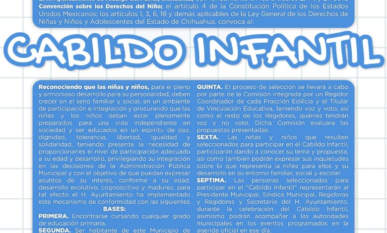 El Gobierno de Parral, a través del H. Ayuntamiento, convoca a niñas y niños de nivel primaria a participar en el Cabildo Infantil 2025, con el objetivo de fomentar su participación activa en temas de interés público y promover el ejercicio pleno de sus derechos en espacios de diálogo y expresión.