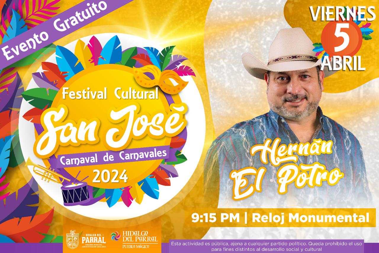 El Festival Cultural San José «Carnaval de Carnavales» tendrá la presentación estelar del renombrado comediante Hernán “El Potro”. El evento se llevará a cabo el próximo viernes 5 de abril a las 9:15 de la noche en el Reloj Monumental, ubicado en el corazón de Parral.