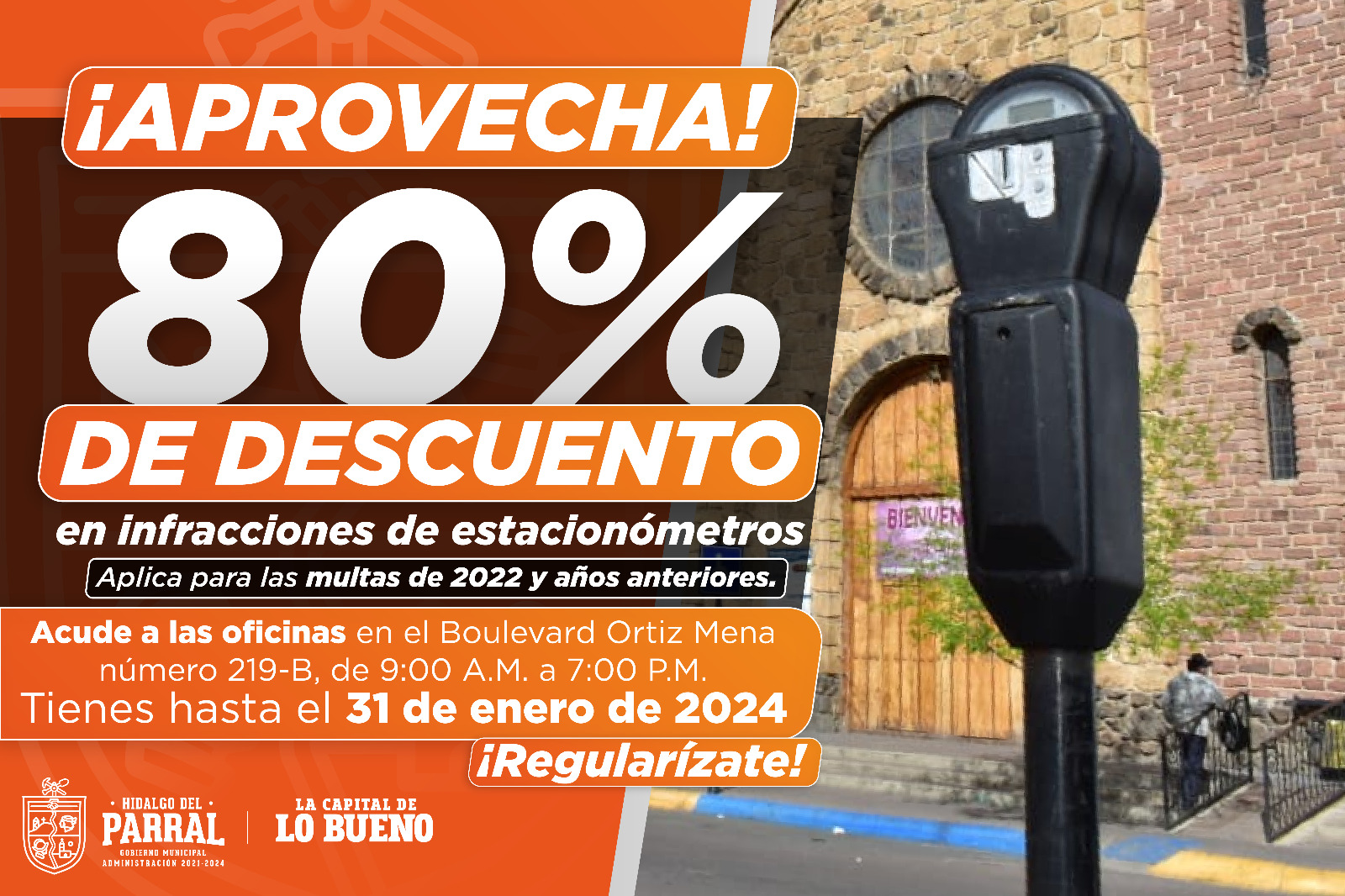 El Gobierno de Parral invita a la ciudadanía a aprovechar el descuento del 80% en las infracciones de estacionómetros acumuladas durante el 2022 y años anteriores. Este descuento especial estará vigente hasta el 31 de enero de 2024.