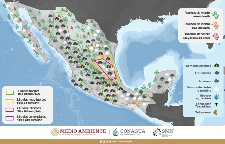 Estas condiciones podrán generar la presencia de lluvias aisladas a dispersas, las cuales pueden estar acompañadas de actividad eléctrica y posible caída de granizo en Ahumada, Guadalupe, Sueco, Chihuahua, Jiménez, La Perla, Nueva Holanda y Coyame.