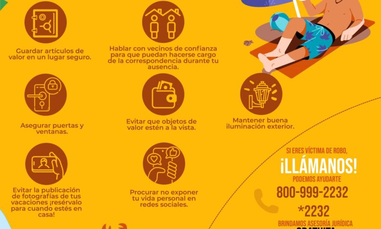 De ahí que FICOSEC por medio de su Línea Ciudadana *2232 promueva la denuncia ciudadana ante cualquier incidente durante la temporada vacacional, las familias eviten ser víctimas de robo a casa habitación u otros delitos, recomendando: