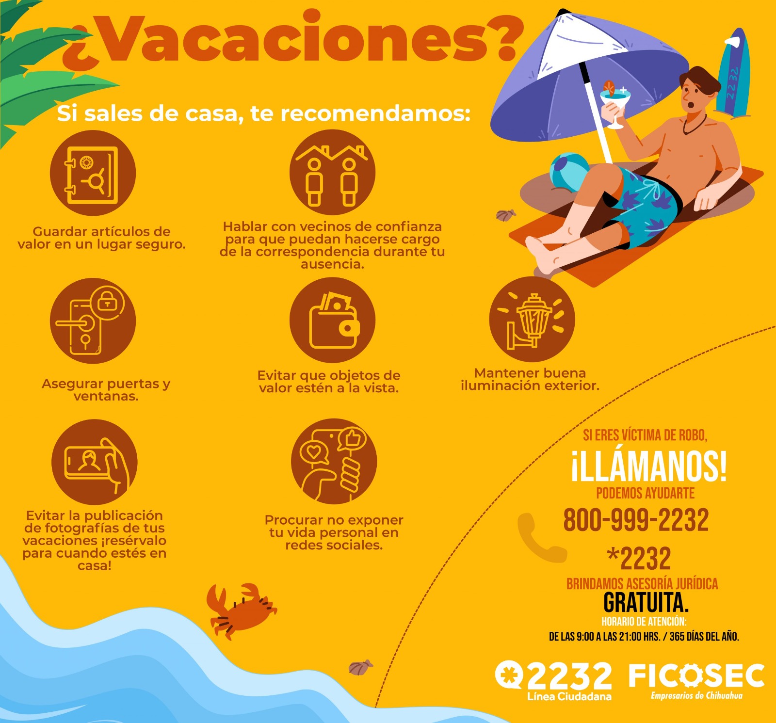 De ahí que FICOSEC por medio de su Línea Ciudadana *2232 promueva la denuncia ciudadana ante cualquier incidente durante la temporada vacacional, las familias eviten ser víctimas de robo a casa habitación u otros delitos, recomendando: