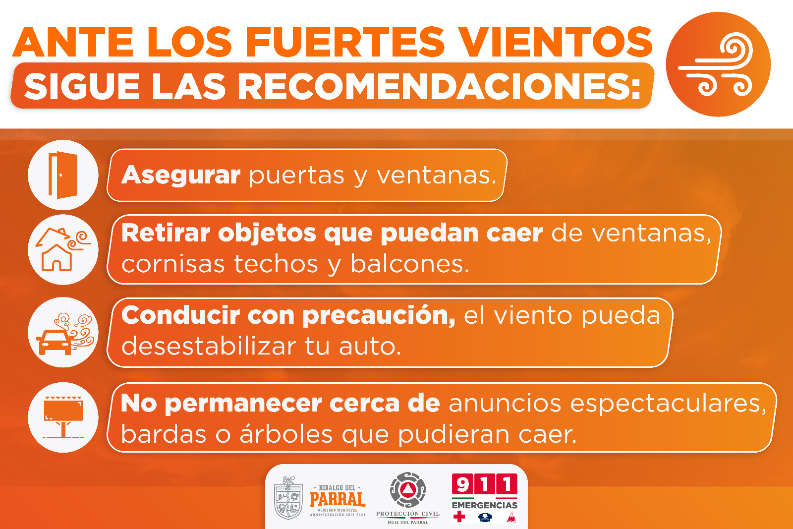La Unidad de Protección Civil hace un llamado a la ciudadanía a tomar medidas preventivas ante el pronóstico del Servicio Meteorológico Nacional que indica la llegada del frente frío 24, el cual generará ráfagas de viento de hasta 120 kilómetros por hora a partir del domingo.