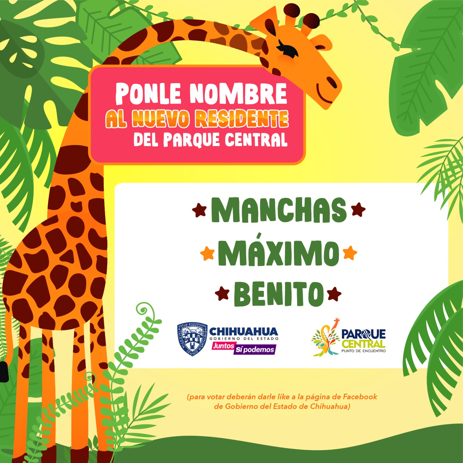 Gobierno del Estado, a través de la Secretaría de Desarrollo Humano y Bien Común (SDHyBC), publica las opciones para elegir el nombre para la nueva jirafa del Parque Central en Ciudad Juárez, mismas que fueron propuestas por niñas y niños de la frontera.