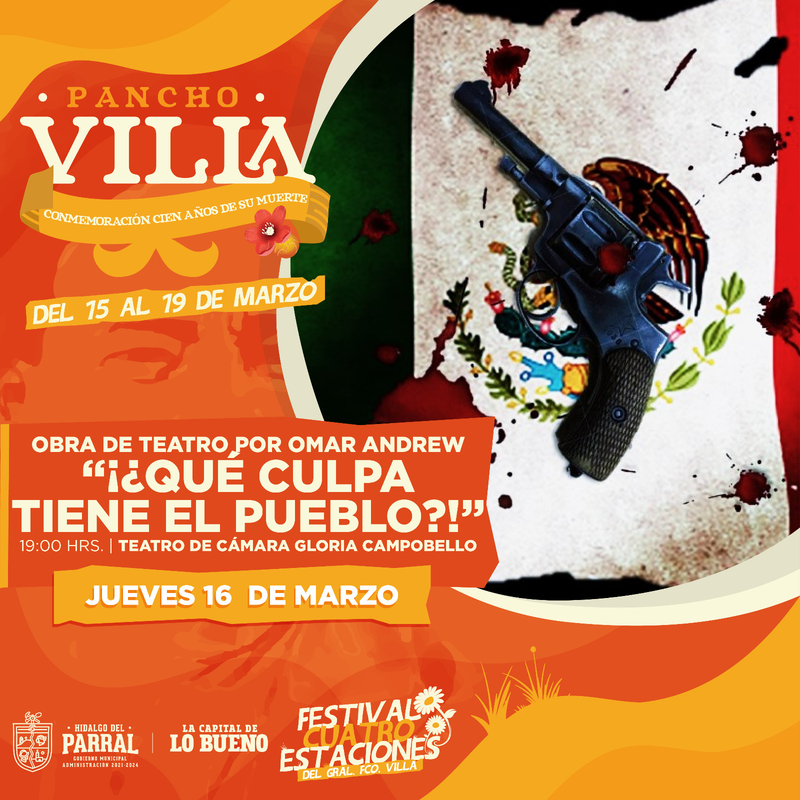 Dentro del Festival de la Cuatro Estaciones organizado por el Gobierno de Parral para conmemorar el centenario de la muerte del general Francisco Villa, se presentará la obra de teatro “¡¿Qué culpa tiene el pueblo?!», dirigida por Omar Andrew.