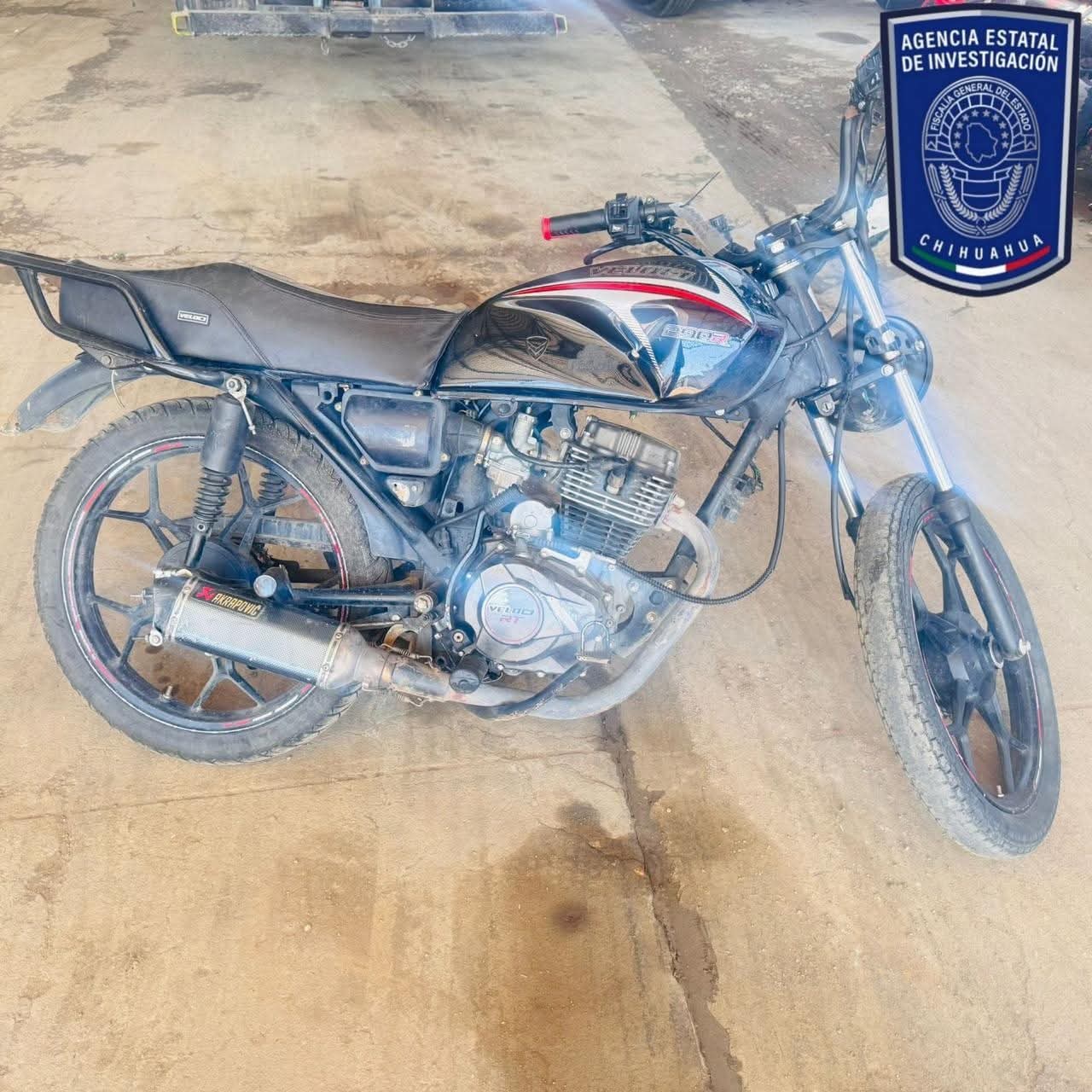 Elementos de la Agencia Estatal de Investigación (AEI) de la Fiscalía de Distrito Zona Sur, recuperaron una motocicleta marca Veloci, línea Boxter RT200, modelo 2024, de color negro, reportada como robada el 24 de agosto del presente año, en la ciudad de Parral.