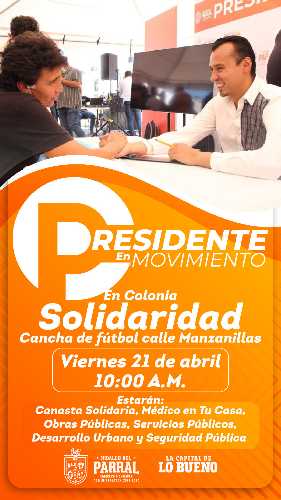 El Gobierno de Parral invita a la ciudadanía a participar en el programa “Presidente en Movimiento”, el cual estará este viernes 21 abril a las 10:00 de la mañana en la colonia Solidaridad.
