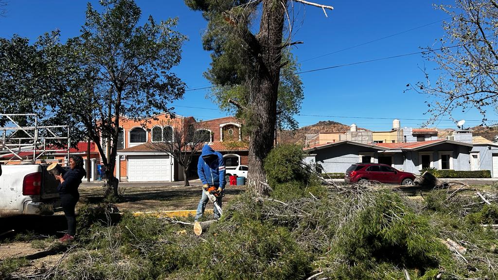 Lo anterior fue dado a conocer por el titular de Servicios Públicos, Alexis Mora Barrón, quien confirmó que el pasado jueves, viernes y sábado, se trabajó arduamente en la evaluación de los daños generados por los vientos, procediéndose a retirar los árboles caídos y los que están en riesgo de perder la verticalidad.