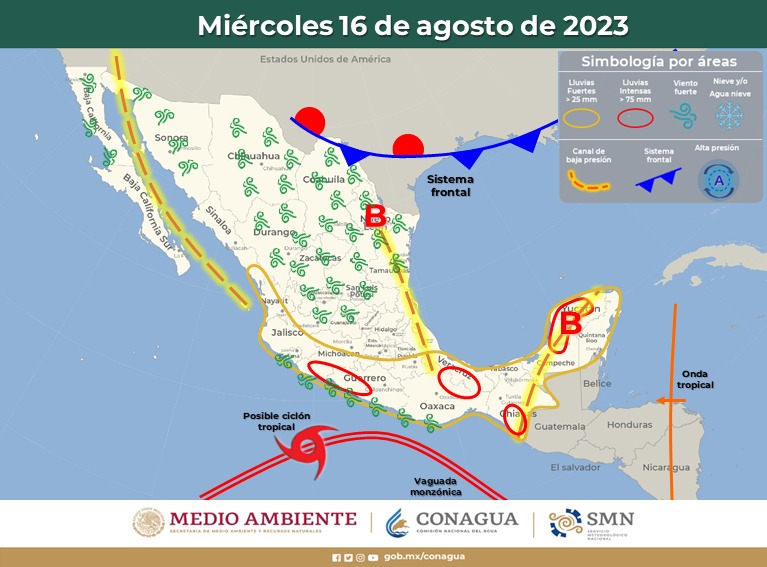En tanto, para los días jueves 17 y viernes 18 de agosto el monzón mexicano estará activo sobre el noroeste de México, interactuando con divergencia en altura, circulación anticiclónica en niveles medios de la atmósfera y un canal de baja presión.